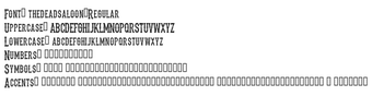The Dead Saloon adalah jenis huruf yang terinspirasi dari suasana kuno dan kasarnya tavern-tavern Barat. Memiliki bentuk huruf yang tinggi dan padat dengan tekstur yang sudah usang, font ini menciptakan kesan berani dan nostalgis. Variasi dalam keluarga font ini memungkinkan pengguna untuk memilih tingkat kekasaran dan bayangan, dari yang lebih bersih hingga yang lebih tertekan, menjadikannya fleksibel untuk berbagai kebutuhan desain.